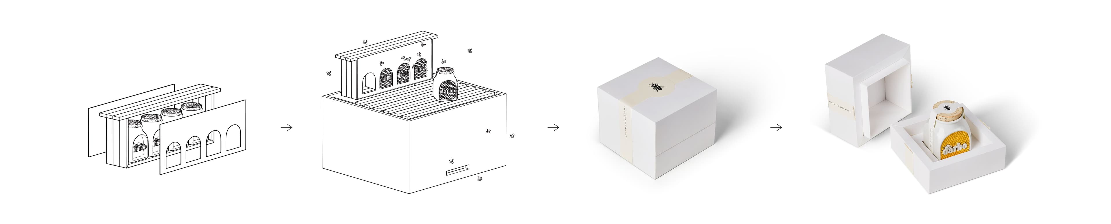 Maßgefertigte Boxen für die Gläser wurden in Bienenstöcken platziert. Jeder Stock produzierte seine eigenen organischen Etiketten.